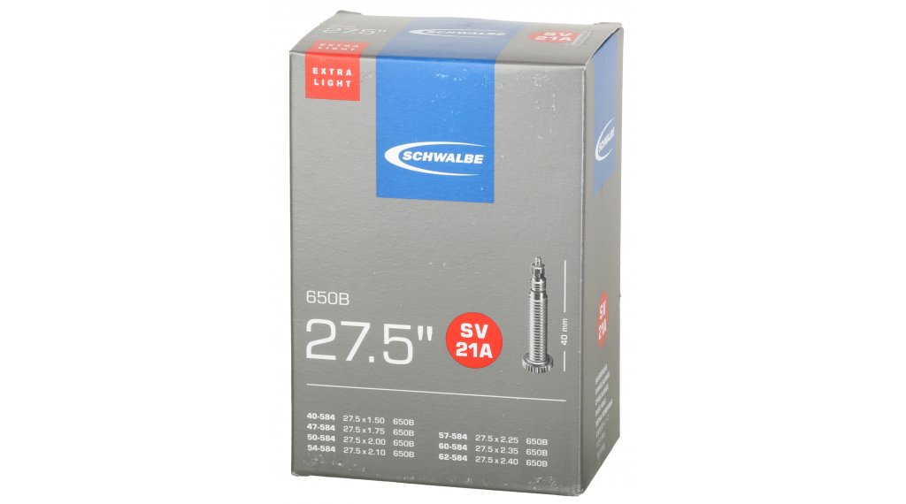 - 1x Schwalbe Schlauch Nr. 21 für 27,5“ SV21A ExtraLight (27.5×1.50-2.40″) frz.-Ventil 40mm, 135g (siehe Artikelbeschreibung für Details)